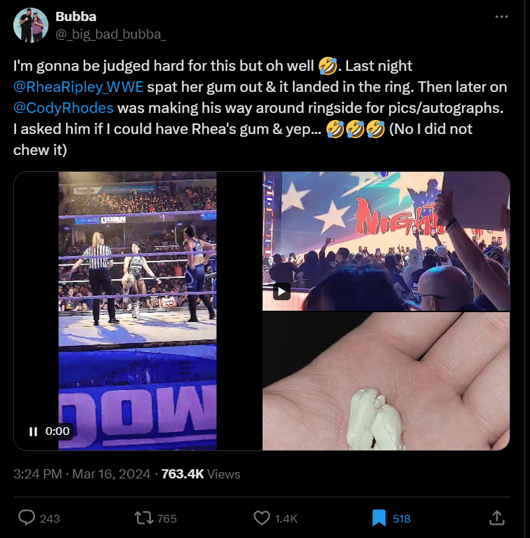 ‘Then later on @CodyRhodes was making his way around ringside for pics/autographs. I asked him if I could have Rhea’s gum & yep… 🤣🤣🤣 (No I did not chew it)’