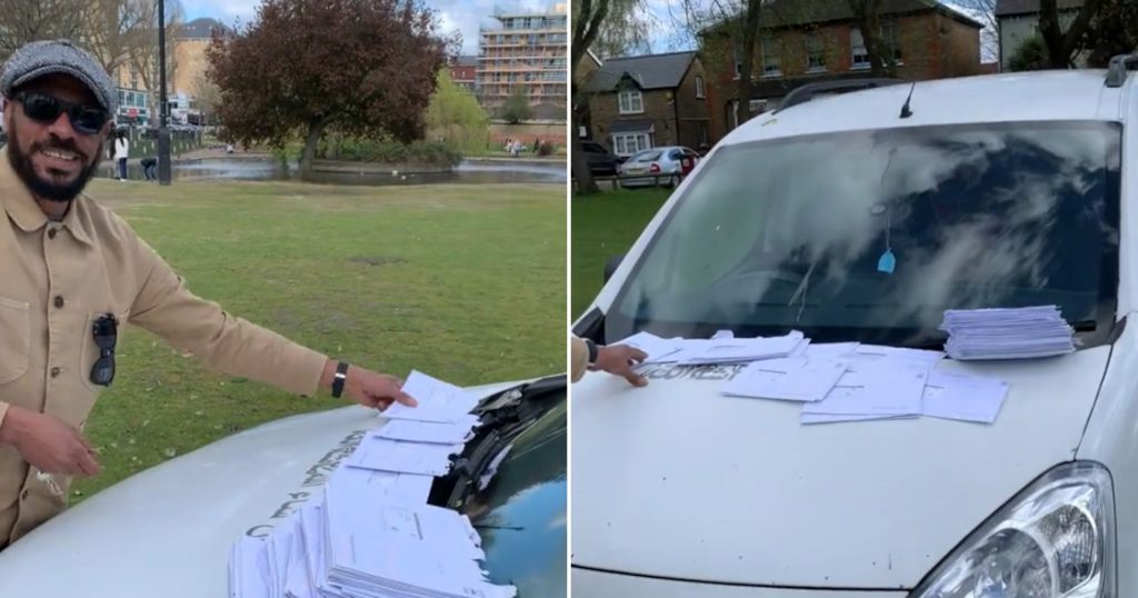 A video of the man, who was not named, has been shared on TikTok and shows him spreading out a pile of unpaid fines in envelopes across the bonnet of his van.