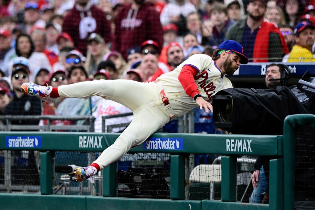 Atlanta’s Austin Riley hit a foul ball off Phillies starter Aaron Nola in the first inning that Harper chased down. He tumbled over a short railing and landed in the photographer’s area in the dugout. Harper lost his hat but got up and walked over the railing to a standing ovation and stayed in the game.