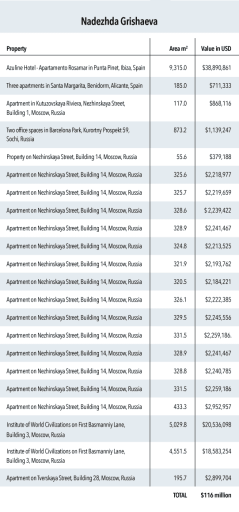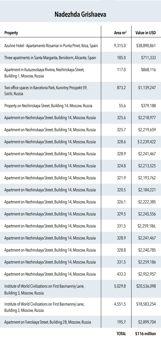At the same time, dozens of apartments and other expensive real estate in Moscow and St. Petersburg were registered to firms associated with Grishaeva and Lebedeva.